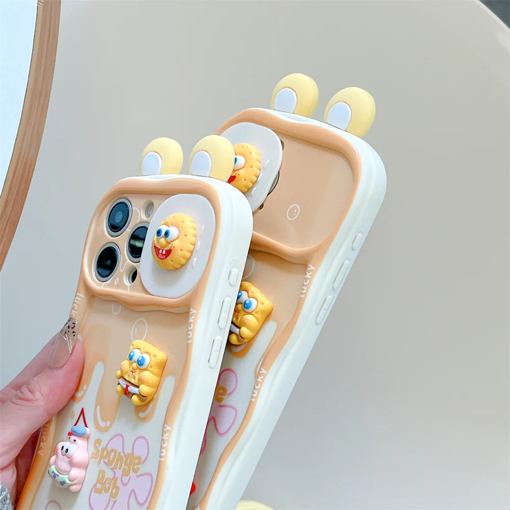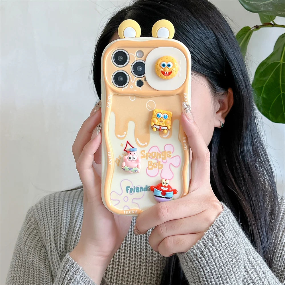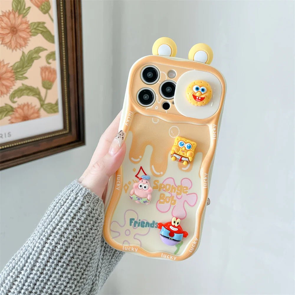 3D Cartoon SpongeBob Patrick Star Push-Pull Camera Phone Case for iPhone 16, 15, 14 Plus, 13, 12 Pro Max, 11 – With Wrist Strap Cover