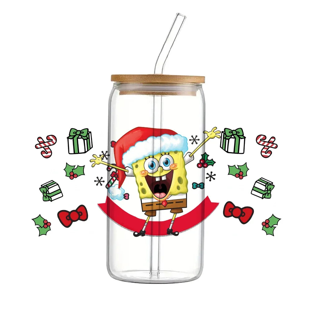 🎄 Christmas SpongeBob & Patrick Star UV DTF Transfer Sticker – Waterproof Decal Wrap for 16oz Glass Cups 🧽🎁🍹