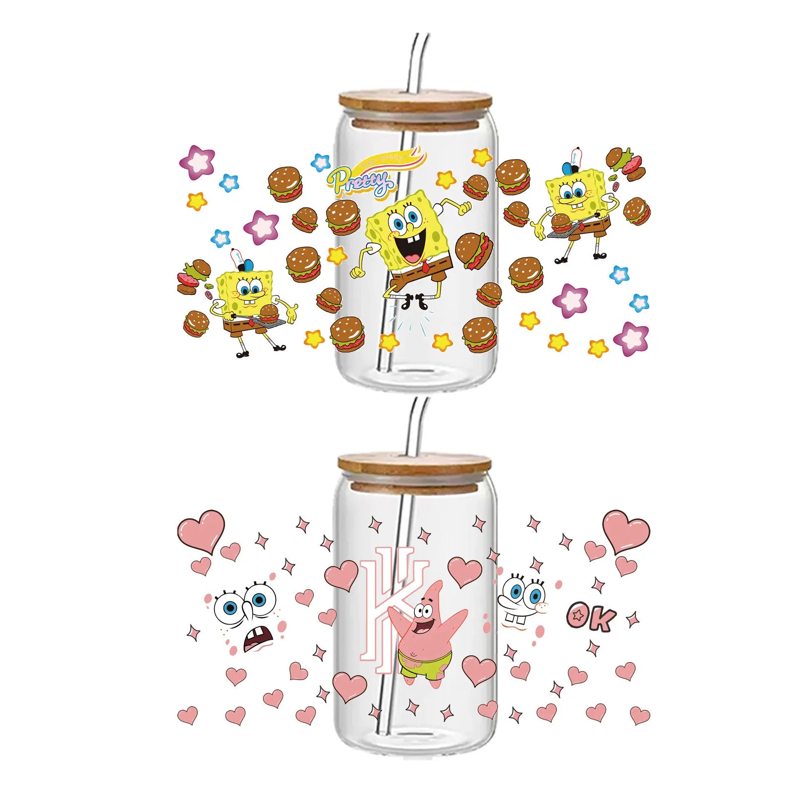 🧽 SpongeBob UV DTF Transfer Sticker – 16oz Libbey Glass Cup Wrap Decal | DIY Permanent, Self-Adhesive & Waterproof 🌊🍹